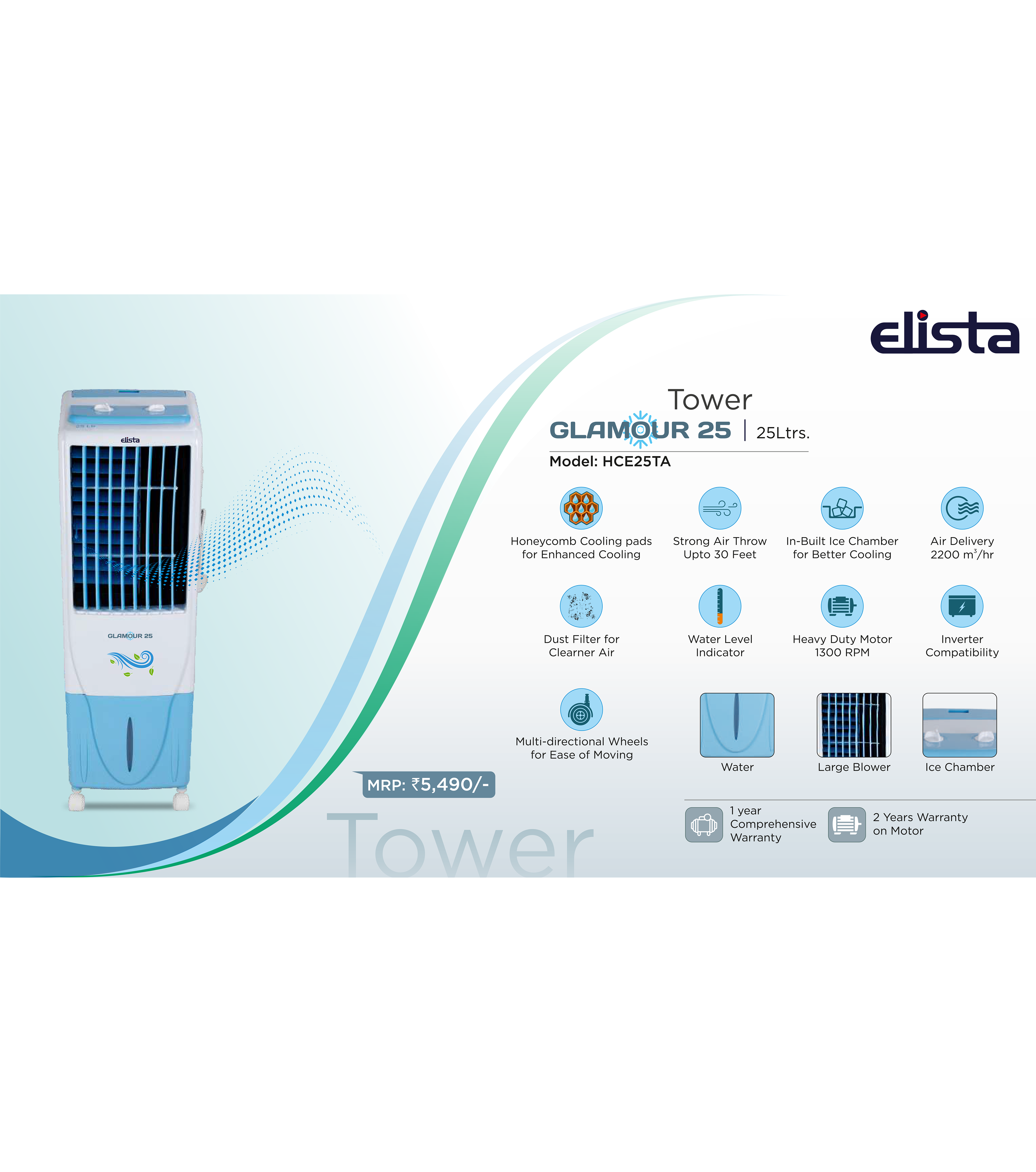 Elista range of air coolers don’t just cool your space, they provide total peace of mind. With latest innovative features that are best in class, our products ensure super cooling, strong air throw and better saving of electricity and water. Features like honey comb cooling pads, remote control. Built-in ice-chamber, mosquito + dust filter, USB charging, power saving and inverter compatibility makes your life cooler, better and chilled out. Now opt for only the best and enjoy life.