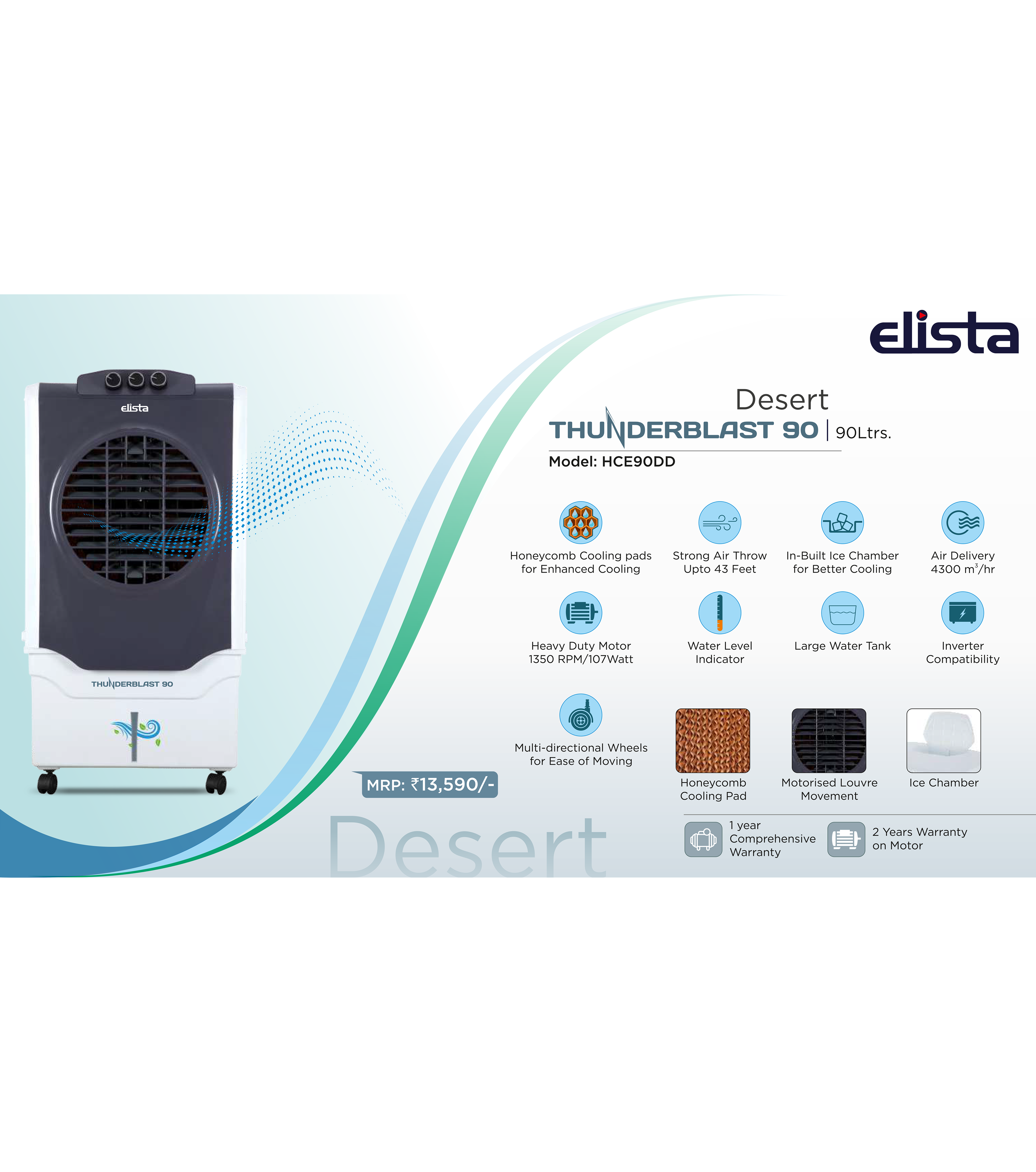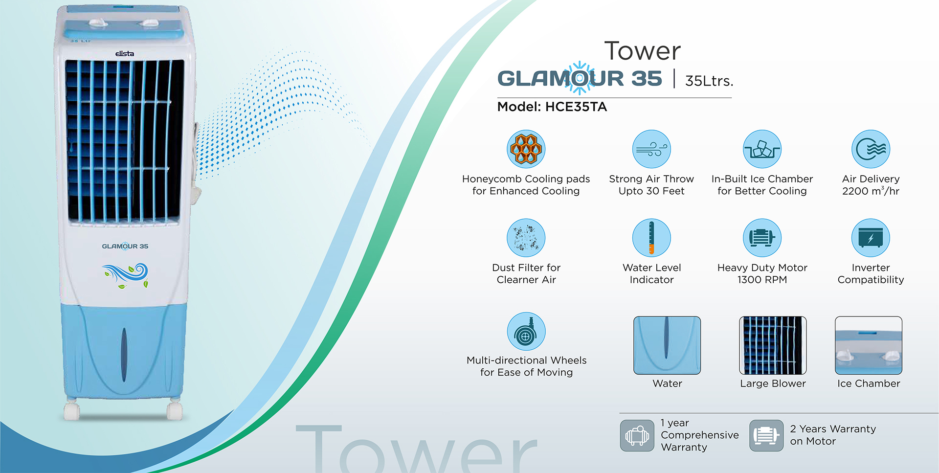 Elista range of air coolers don’t just cool your space, they provide total peace of mind. With latest innovative features that are best in class, our products ensure super cooling, strong air throw and better saving of electricity and water. Features like honey comb cooling pads, remote control. Built-in ice-chamber, mosquito + dust filter, USB charging, power saving and inverter compatibility makes your life cooler, better and chilled out. Now opt for only the best and enjoy life.